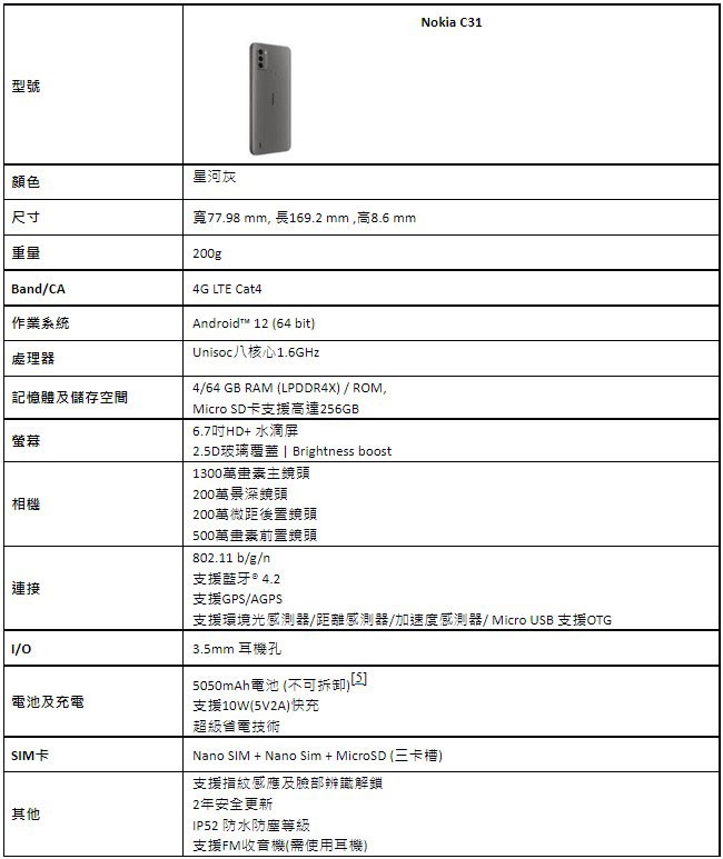 Nokia C31 為Nokia 11月將上市的4G入門手機,具6.7吋HD+大螢幕+ 5050mAh電池容量,台灣建議售價為$4,390。
