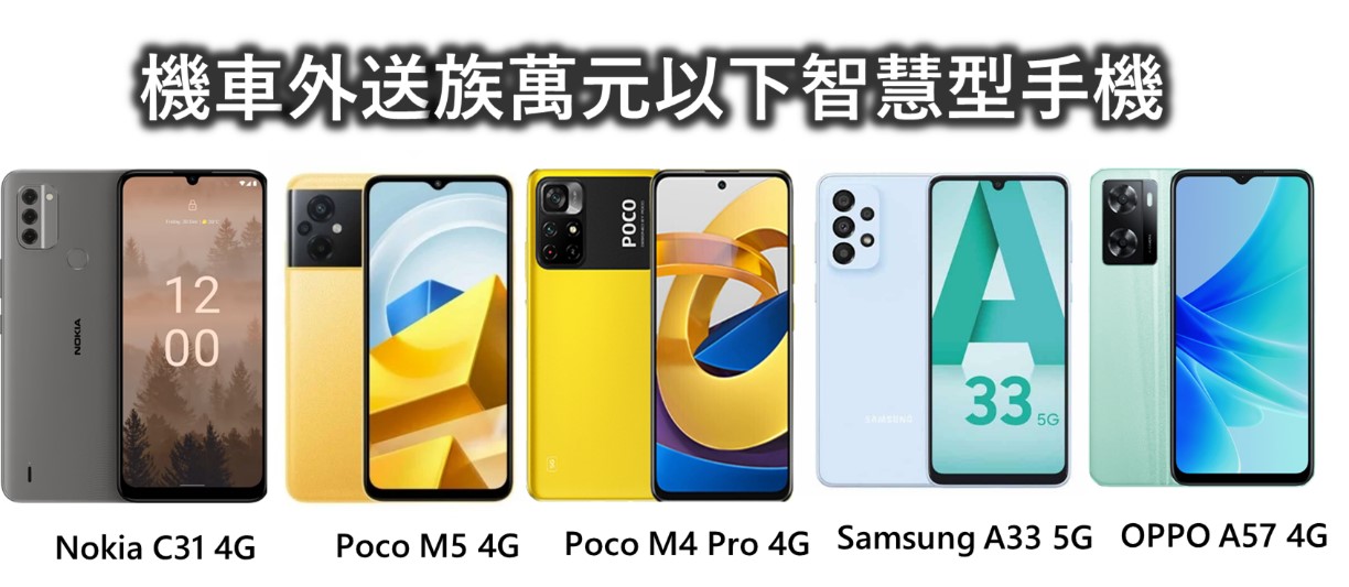 由於從事外送的機車族通常是經濟並不寬裕的甘苦人,版主推薦的六款手機為Nokia C31 4G、POCO M5 4G/M4 Pro 4G、OPPO A57 4G、三星A33 5G/A53 5G。4G手機目前空機市售價大概在$4000 ~5500, 5G手機則是萬元有找,經濟能力佳的果迷可以忽略本文。