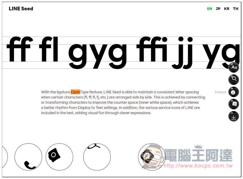 LINE Seed 的簡單形式代表了 LINE 的普遍性和友好性。此外,圓角是所有字體和字符的通用元素,包括字母、數字、符號和圖標: