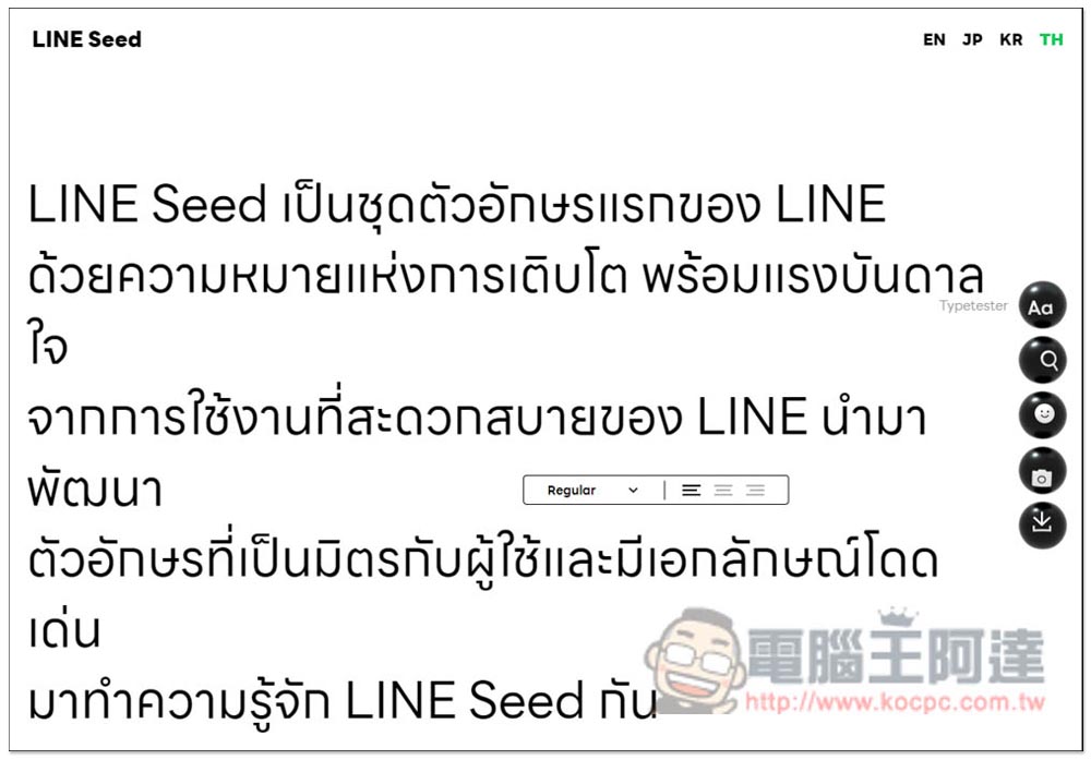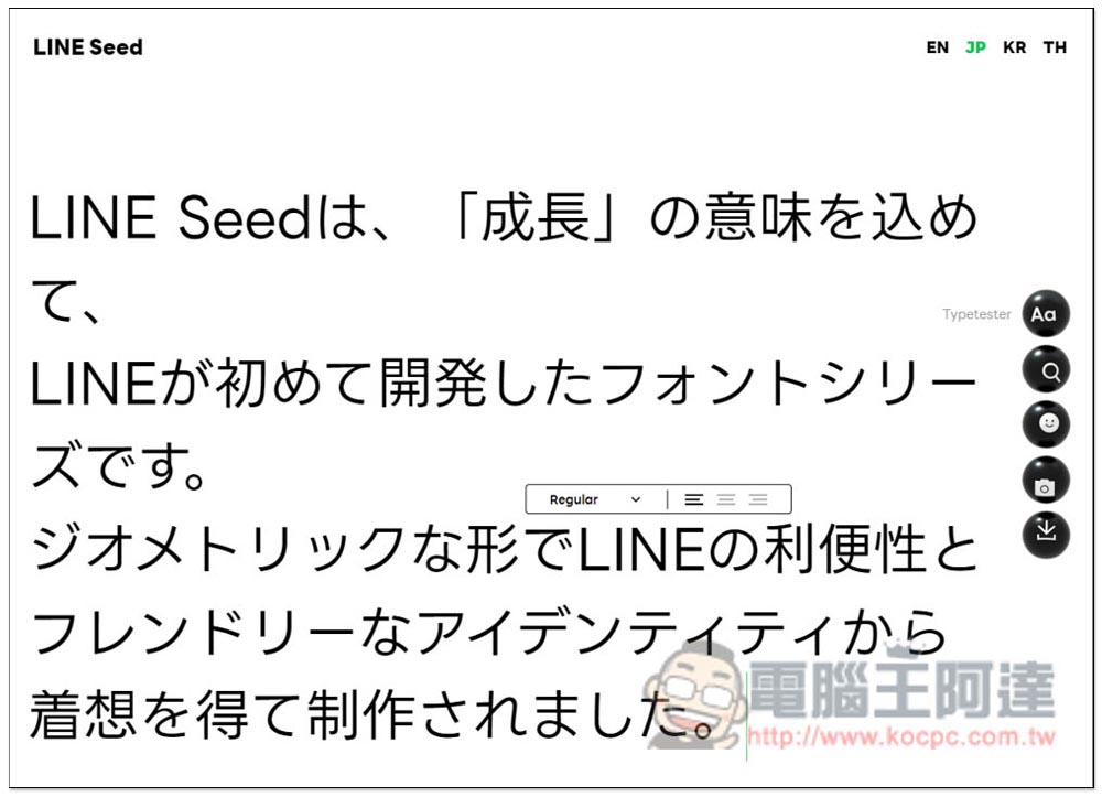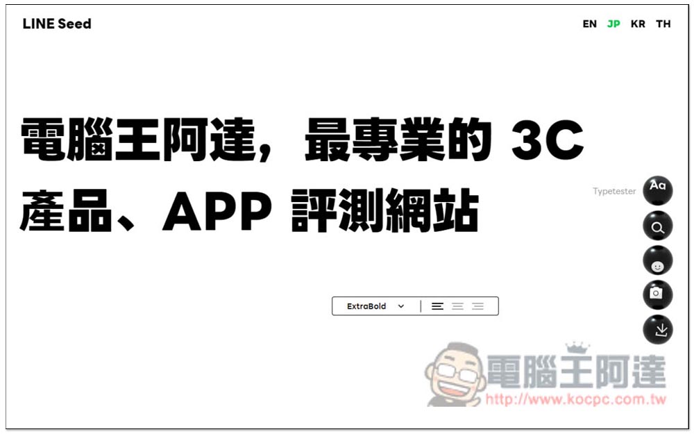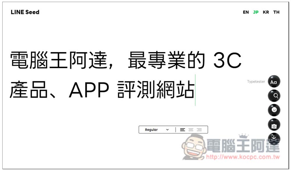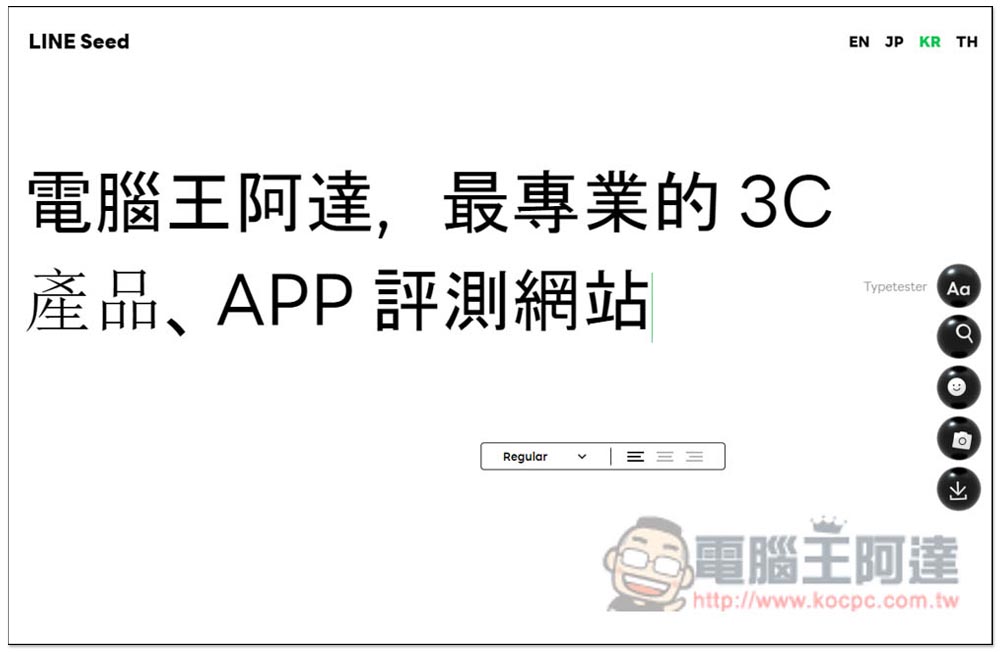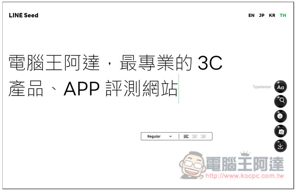 進到 LINE Seed 系列免費開源字體網站之後,右上角有 EN(英文)、JP(日文)、KR(韓文)和TH(泰文)四個語言選項,每個都能下載到該語言的專屬字體,也就是字體檔不太一樣,另外,首頁最上方這行字是讓你測試的,你可以刪除,然後輸入想要的文字內容: