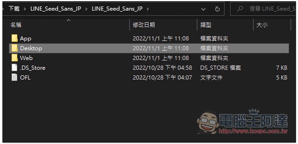下載解壓縮之後,會有三個資料夾,App、Desktop 與 Web,OFL 則是授權文件說明,使用前可以看一下: