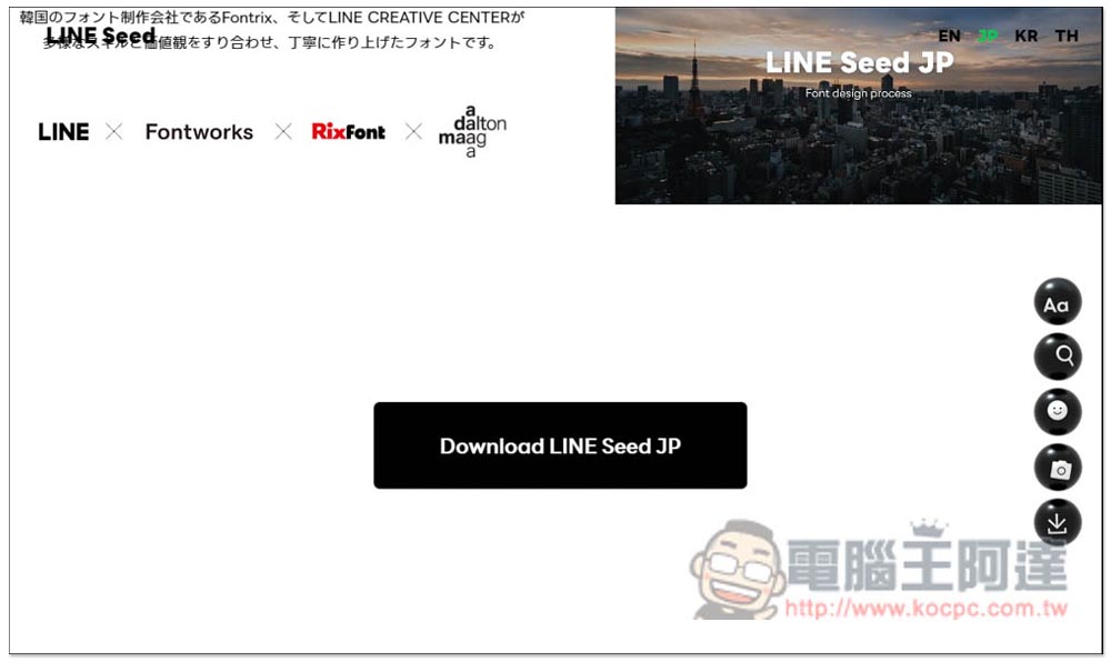 下載方式也很簡單,滑到頁面最下方後,就能看到 Download LINE Seed JP/KR/TH/EN 的下載按鈕,下圖是日文字體,因此顯示 Download LINE Seed JP: