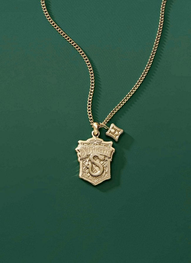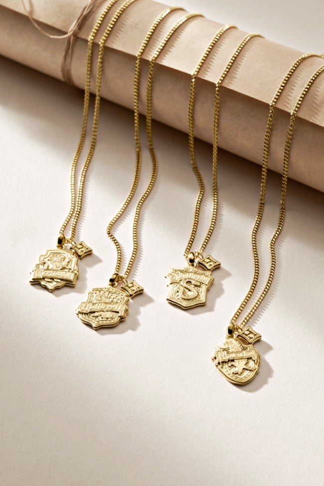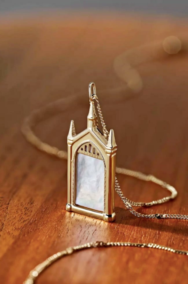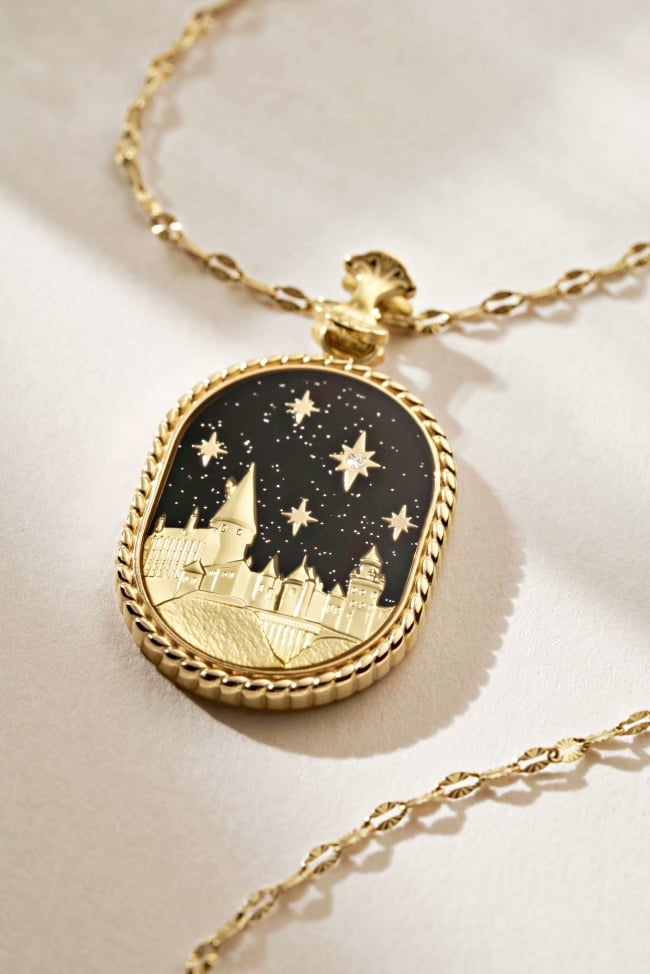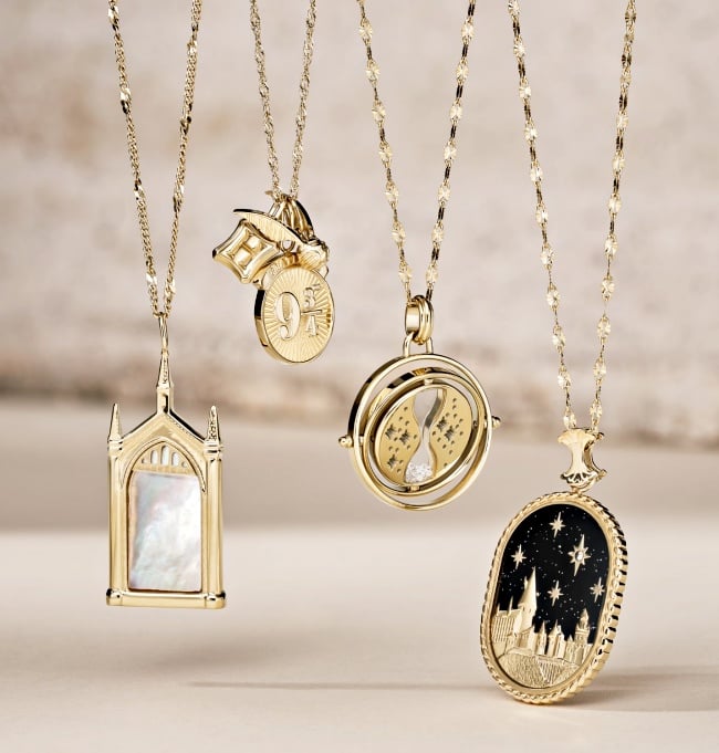 只有巫師可以穿過的9又4分之3月台、映照出內心渴望的意若思鏡以及夜空下的霍格華茲城堡也被打造成「金色聯名項鍊」,同時還可以收死神的聖物、哈利波特閃電印記、有翅膀的飛行鑰匙的迷你版耳環,甚至連「金探子」都能用耳尖抓住。