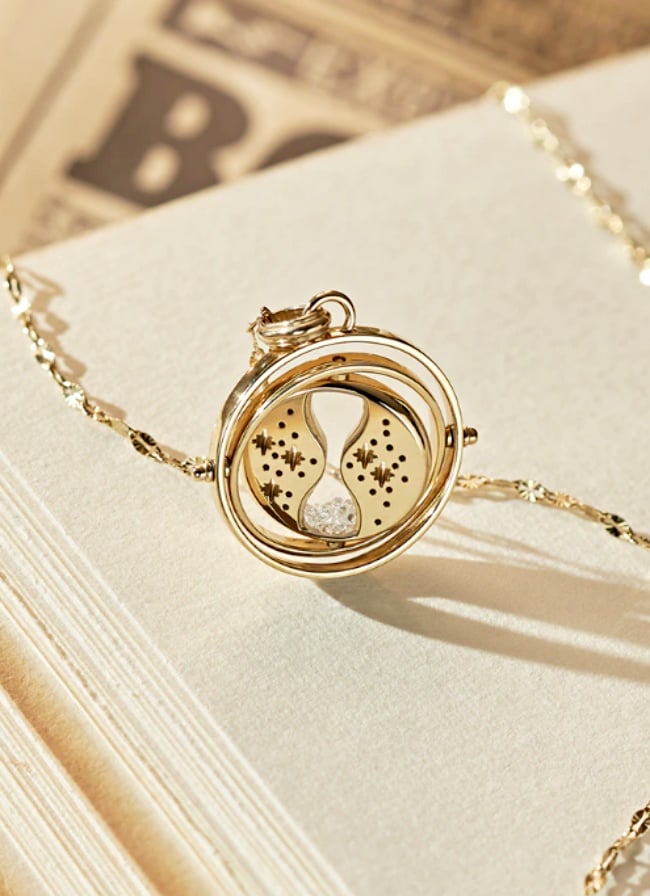 有如懷錶一般的金色圓形吊飾、正中央鑲著可以流動的沙漏,轉動沙漏的次數,即代表著時間回溯的小時數…學霸「妙麗」用來開外掛的「時光器」,100%神還原!而且沙漏裡真的有寶石、還能轉動,精緻到不行~