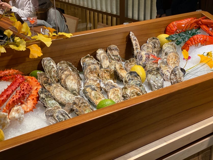 生蠔海鮮吧更在下午餐期(14點-17點)期間特別推出限定嚴選的「季節海鮮盛合」,雙人經典盛合有波士頓龍蝦、生蠔、鮑魚、紅魽刺身、紅魽腹刺身、鮪魚剌身、北海道干貝和魚卵等,當然想要吃高級的也有「雙人豪華盛合」,附有整隻帝王蟹腳、炙燒鰹魚和日本馬糞海膽,兩種都加碼附「龍蝦味噌湯」!