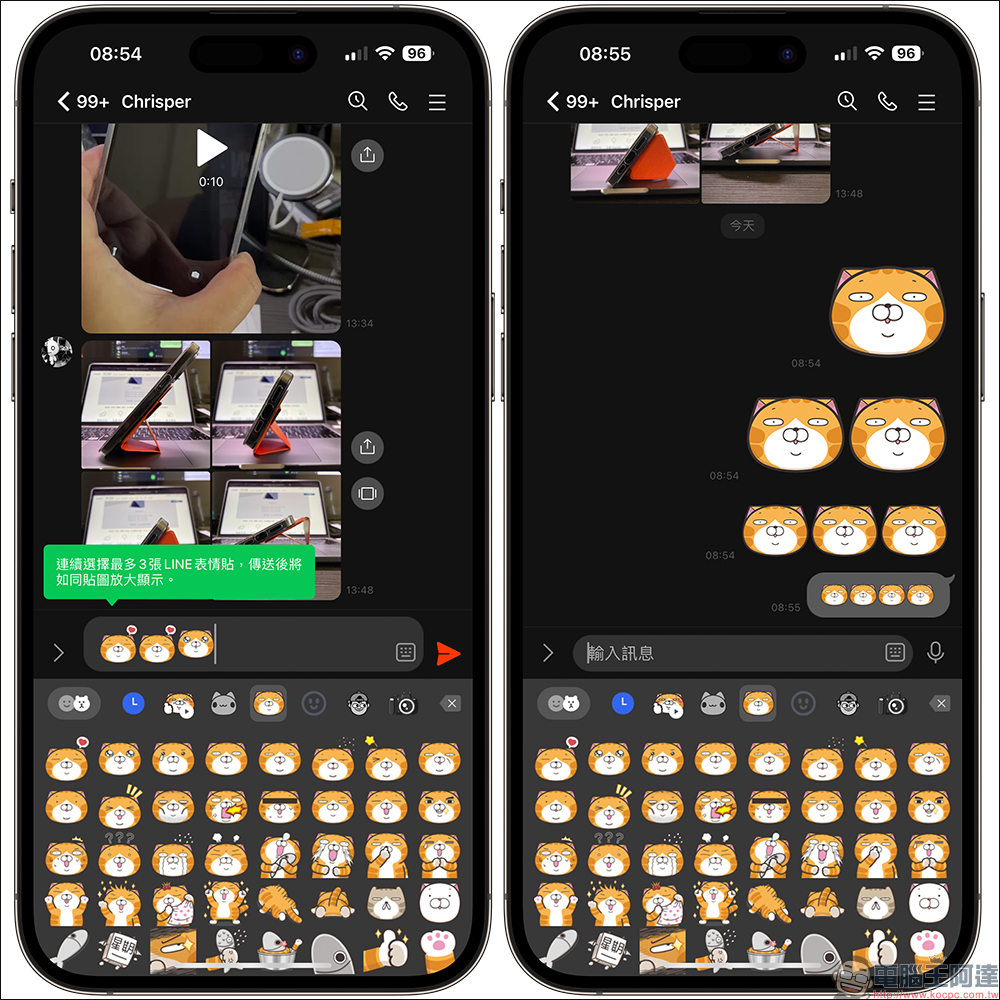另外,補充一下之前更新許多 LINE 用戶可能沒注意到的小更新,就是 LINE 表情貼支援最多 3 張的貼圖放大顯示!當我們傳送 LINE 表情貼時,在 3 張以內都會顯示為大圖,直到一次傳送 4 張起才會是顯示小張的 LINE 表情貼。