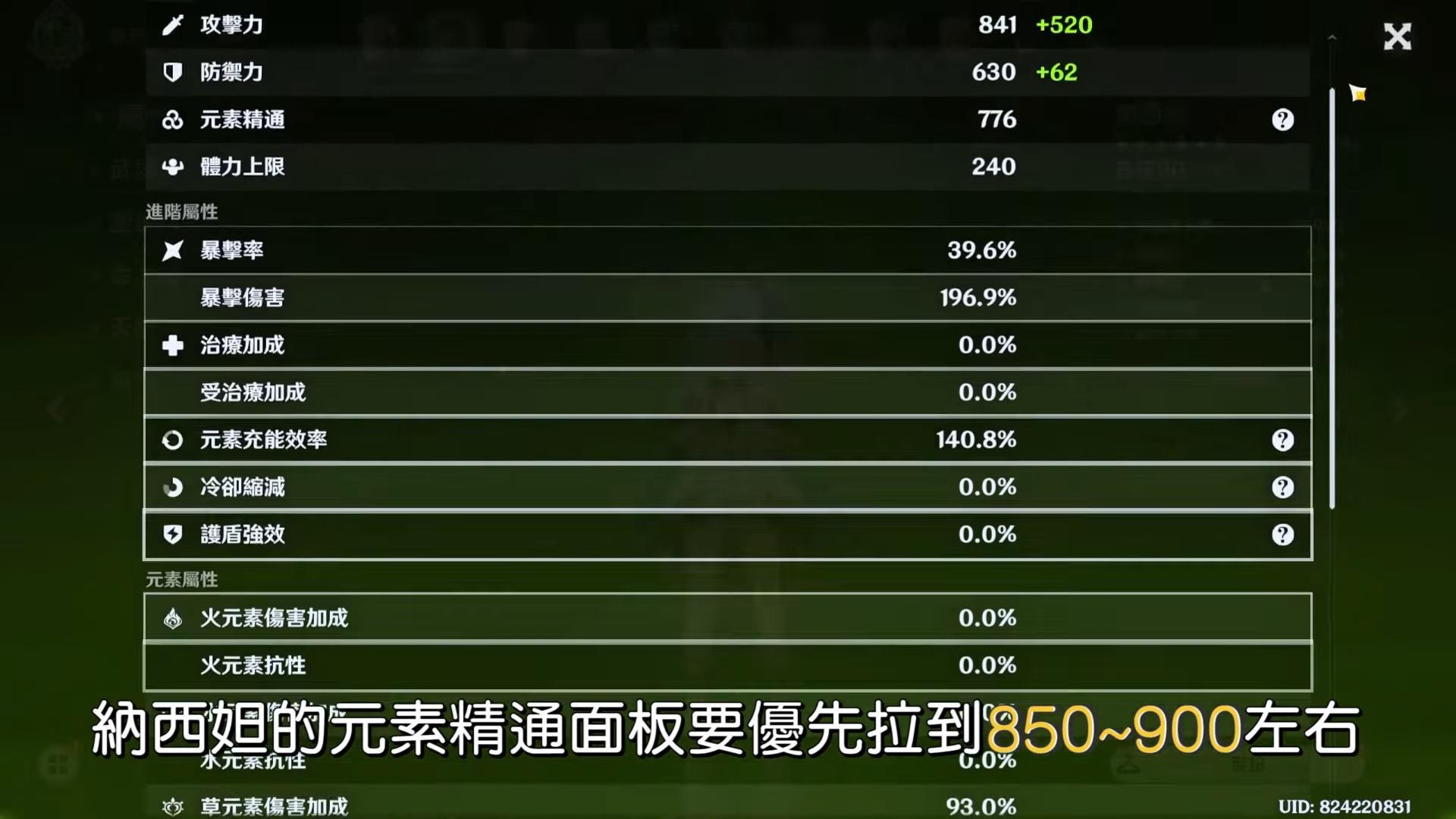 因為被動天賦2機制的關係,納西妲的元素精通面板要優先拉到850~900左右,而也因為隊伍中可能會有帶一些提供元素精通加成的隊友、或是納西妲有持專武、有抽4命、有提升元素精通的聖遺物效果等等,所以自己要算一下是否加上這些後會超過1000,850~900是洛洛大致上擬出的一個基準值,每個人可能不太一樣,因此如果懶得算的話可以參考洛洛的畢業數值。