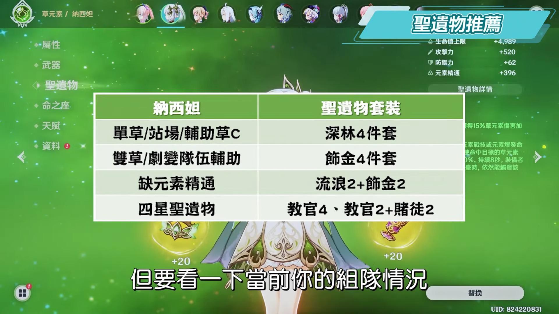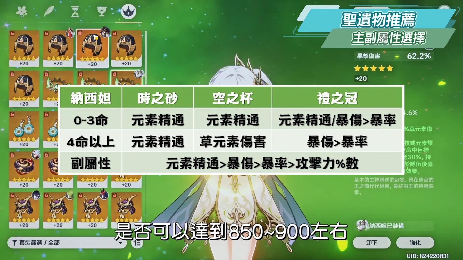 聖遺物主副屬性選擇,一樣優先考慮自身納西妲的元素精通面板是否可以達到850~900左右,假如很缺元素精通,則優先讓時之砂、空之杯、禮之冠的主屬性都是元素精通,而如果元素精通可以來到900左右,也因為被動天賦會提供暴擊率加成,所以可以把禮之冠優先換成暴擊傷害,其次暴擊率,4命以下的納西妲基本上都是穿全元素精通,頂多禮之冠會是換成暴傷頭,而4命以上就可以轉成草傷杯+暴傷頭。