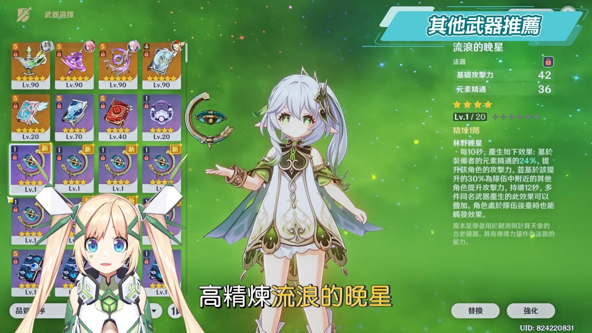 其他武器的部分,從元素精通向考慮的話可以選擇高精煉流浪的晚星,還可以提供隊友攻擊力加成,只是這把武器是限定四星,所以上一池沒有抽妮露武器的人可能就沒有幾把,另外則會比較推薦流浪的樂章,切角登場時一共會有三種BUFF,都是納西妲吃得到的加成,站場或輔助皆可用,再來也可以考慮用三星的魔導緒論,滿精煉情況下效果會再比滿精煉流浪的晚星還要再好一點,主要是因為被動可以使受到水或雷元素影響下的敵人傷害提升,主屬性提供元素精通之餘,被動放在綻放或激化隊也都可以用,取得上也比流浪的晚星容易滿精煉,其他輔助向還可以考慮的有祭禮殘章、萬國諸海圖譜、但祭禮殘章的被動不是很實用,萬國諸海圖譜的效果要站場才有也不算太好用,缺暴率可以考慮的還有匣里日月,沒提到的武器基本上就不是太推薦,還不如直接用三星魔導緒論。而若是讓納西妲作為隊伍中的奶媽位置的話,也可以選擇穿戴試作金珀。
