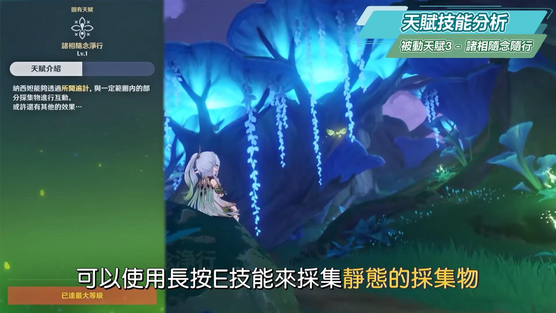 納西妲的被動天賦3可以使用長按E技能來採集靜態的採集物,不會動的動物或植物基本上都可以採,像是植物、鳥蛋、星螺、鬼兜蟲這類都可以,但像是會動的聖金蟲、蝴蝶和礦物類的都不行、其他開寶箱、任務相關或是打怪掉落的物品也不行、要透過特殊方式採集的烈焰花或緋櫻繡球也不行,雖然可以採比較麻煩的劫波蓮和琉璃袋,但可惜的是不能抓晶蝶。另外E技能在對須彌地區中有名字的NPC長按使用時,可以看到他們的內心話和心情,而且還有語音。