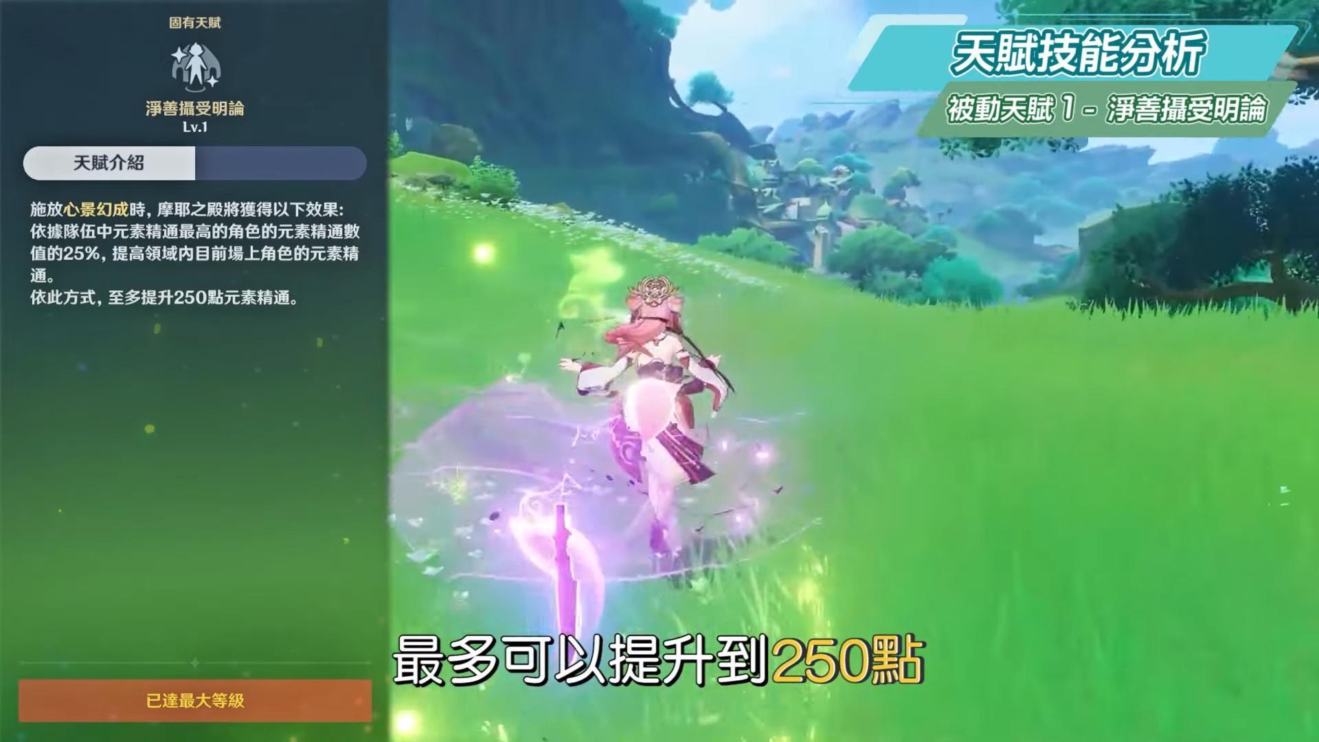 被動天賦1會在納西妲開大後,依據隊伍中最高元素精通的該名角色的元素精通數值的25%,提高領域內當前場上角色的元素精通,最多可以提升到250點,提供的數值是鎖面板的,並且BUFF轉換計算是看當下最高精通角色的「非額外元素精通」的總和,例如砂糖的被動天賦提供的百分比元素精通加成就屬於「額外元素精通」,並不會被納西妲的被動天賦轉化,而若是納西妲的4命效果、阿貝多和鹿野院平藏的被動天賦、飾金套的4件套效果、武器的數值等等,才是提供能被轉化的非額外元素精通,因此如果是穿飾金套的納西妲,就記得先觸發元素反應和套裝效果後再開大。