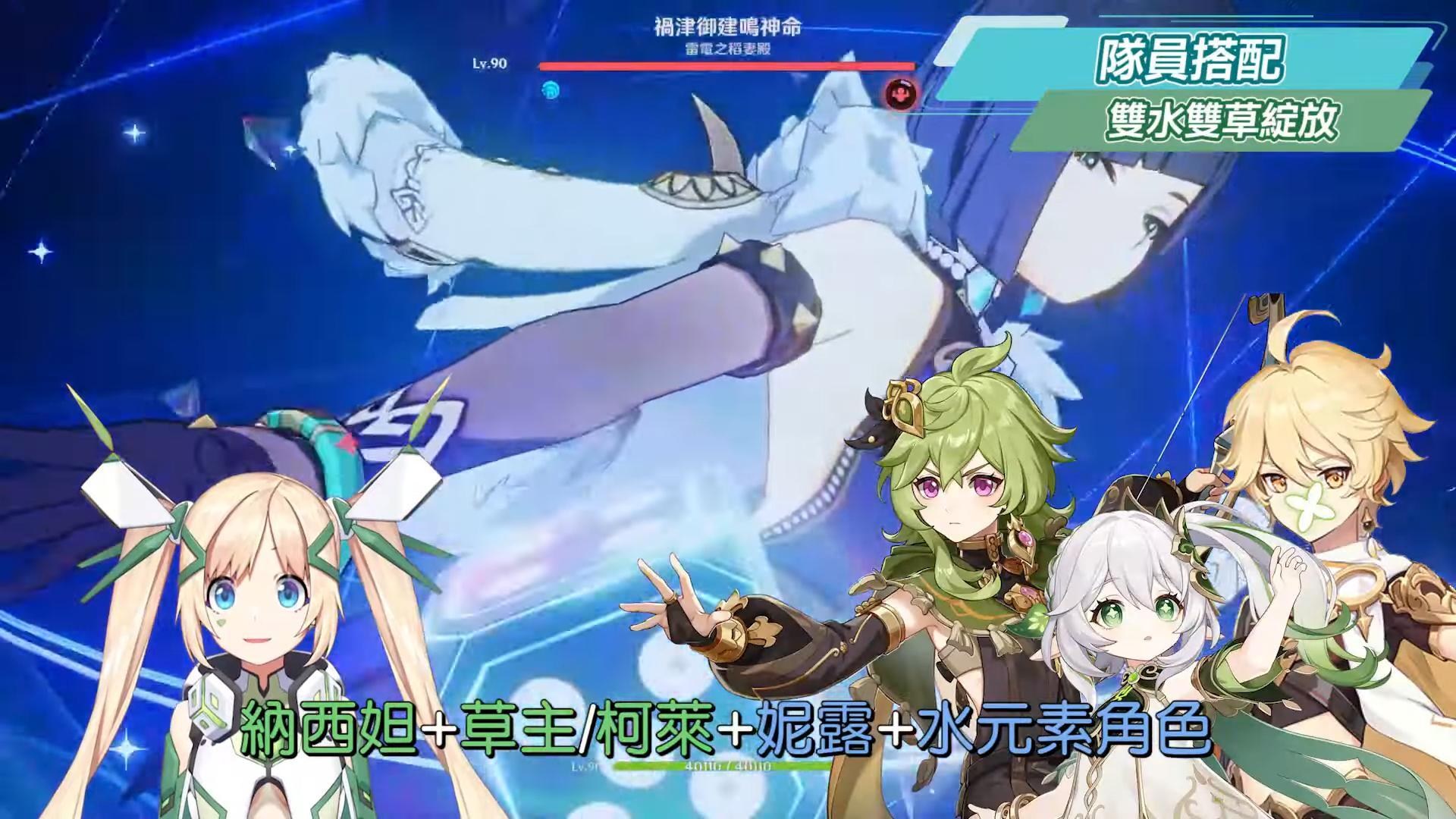 雙水雙草綻放隊為妮露的水草綻放隊,隊伍組成為納西妲+草主/柯萊+妮露+水元素角色,水元素的角色選擇有很多,假如納西妲為站場定位的話,選用元素精通與雙暴相關聖遺物與武器,水元素可以搭配奶媽心海或芭芭拉,而假如是納西妲作為奶媽定位則帶試作金珀,但要注意奶量若是不足的情況下要小心被自己炸死,此外也可以考慮納西妲單草站場,剩下三名全部為水元素角色的綻放隊玩法。