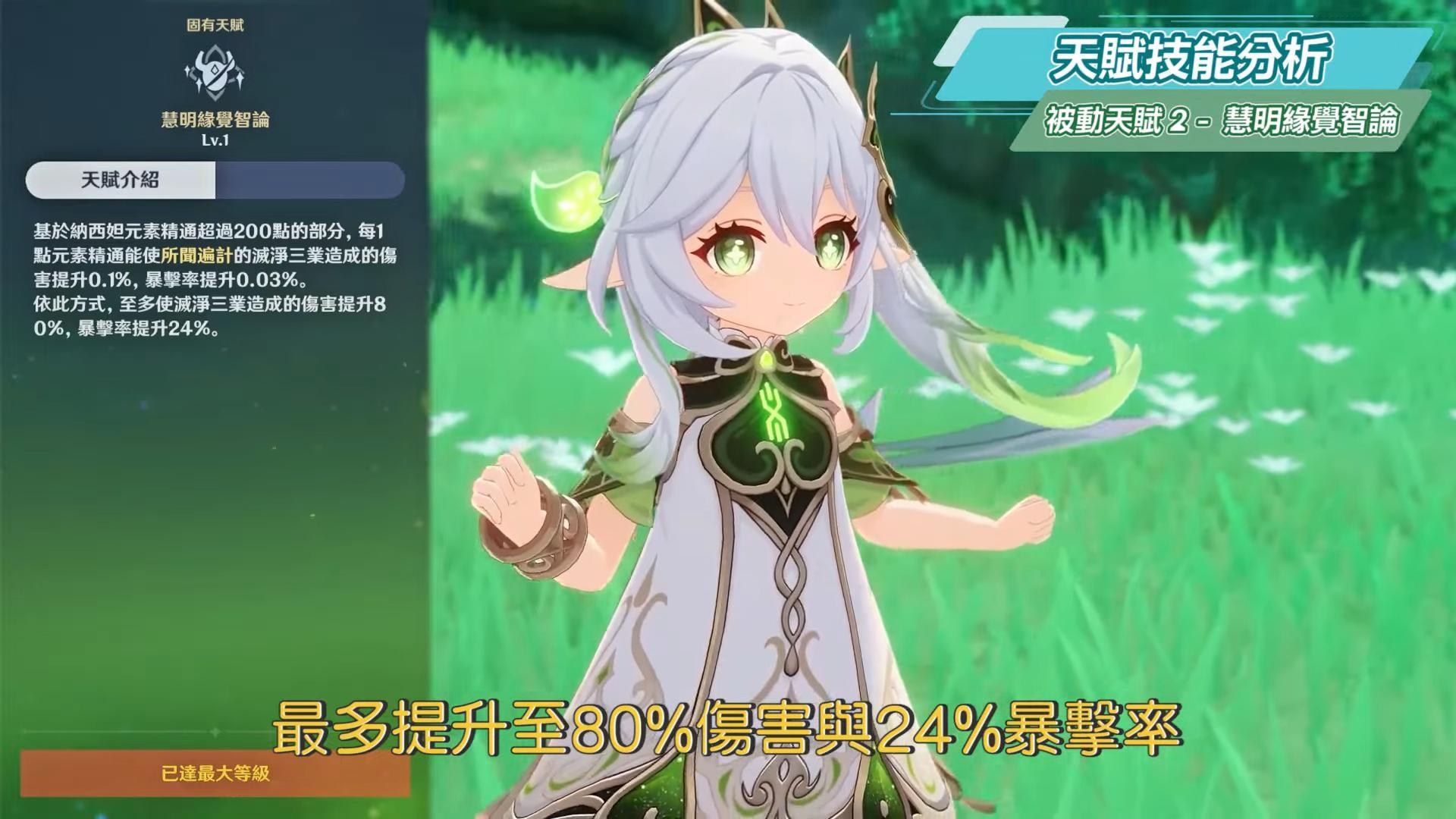 被動天賦2會使納西妲在自身超出200點以上的元素精通時,每1點元素精通提升滅淨三業的傷害0.1%、暴擊率0.03%,最多提升至80%傷害與24%暴擊率,這個機制使得納西妲的元素精通最多就是堆到1000,超過1000的元素精通都將近等於沒有任何收益,這裡的元素精通加成會計算進納西妲所有的元素精通,不論是額外或是非額外的元素精通,都可以被轉化,而被轉化的滅淨三業傷害加成,是屬於增傷區間,與草元素傷害是分開相加計算,而暴擊率加成不會直接顯示在面板中。