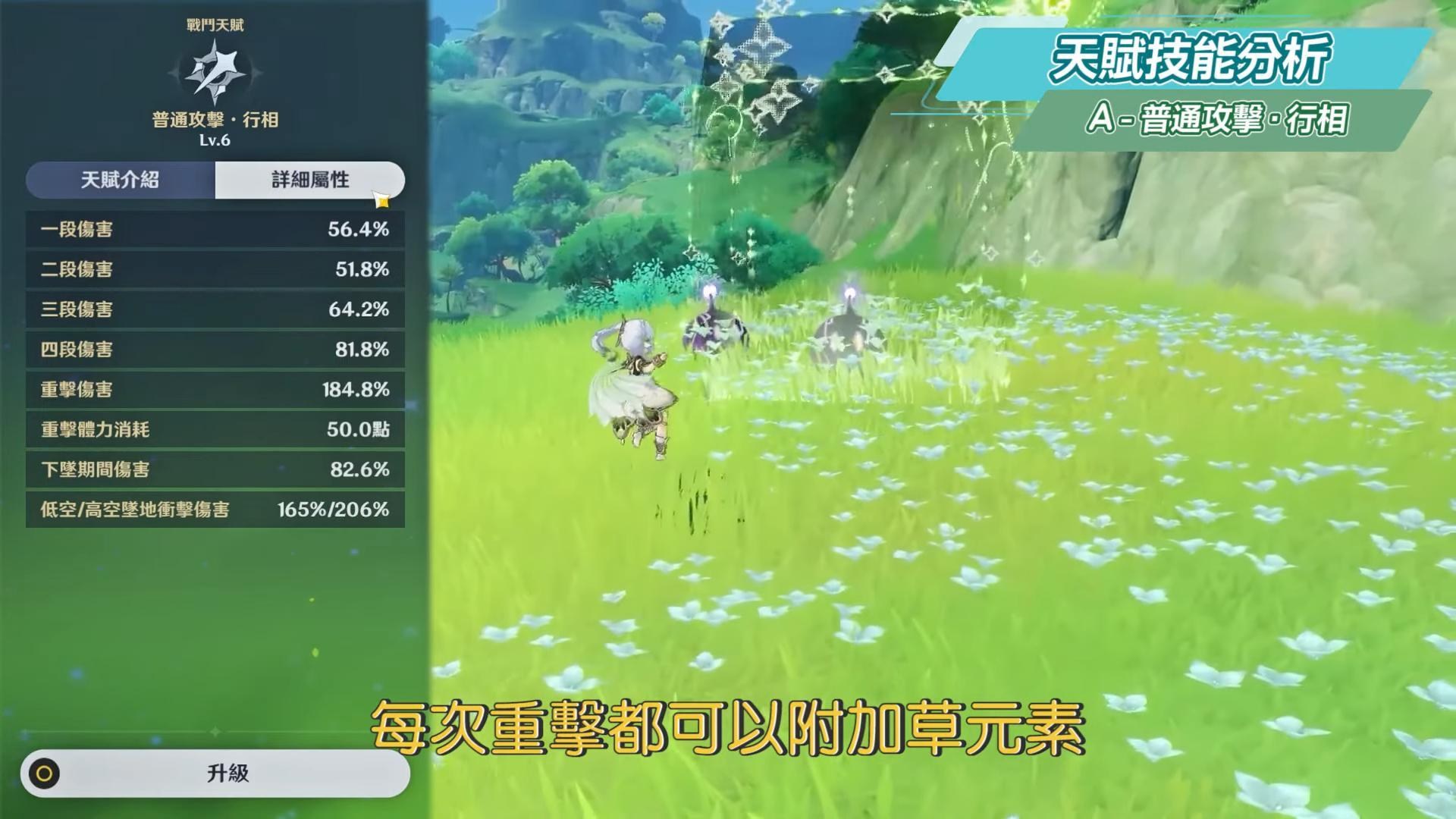 納西妲的普攻是四段式的草元素傷害,攻擊方式是類似踩鍵帽的地面攻擊波,攻擊距離較短,重擊則是一個正方體的草元素範圍傷害,站場輸出的時候要與敵人的位置稍微離得近一點才會比較容易命中,而普攻、重擊、下落攻擊的草元素附著皆為弱草元素,同時普攻會遵守元素附著間隔的機制,也就是2.5秒內每間隔2次攻擊施加草元素附著,但重擊的草元素附著和普攻分開,每次重擊都可以附加草元素。