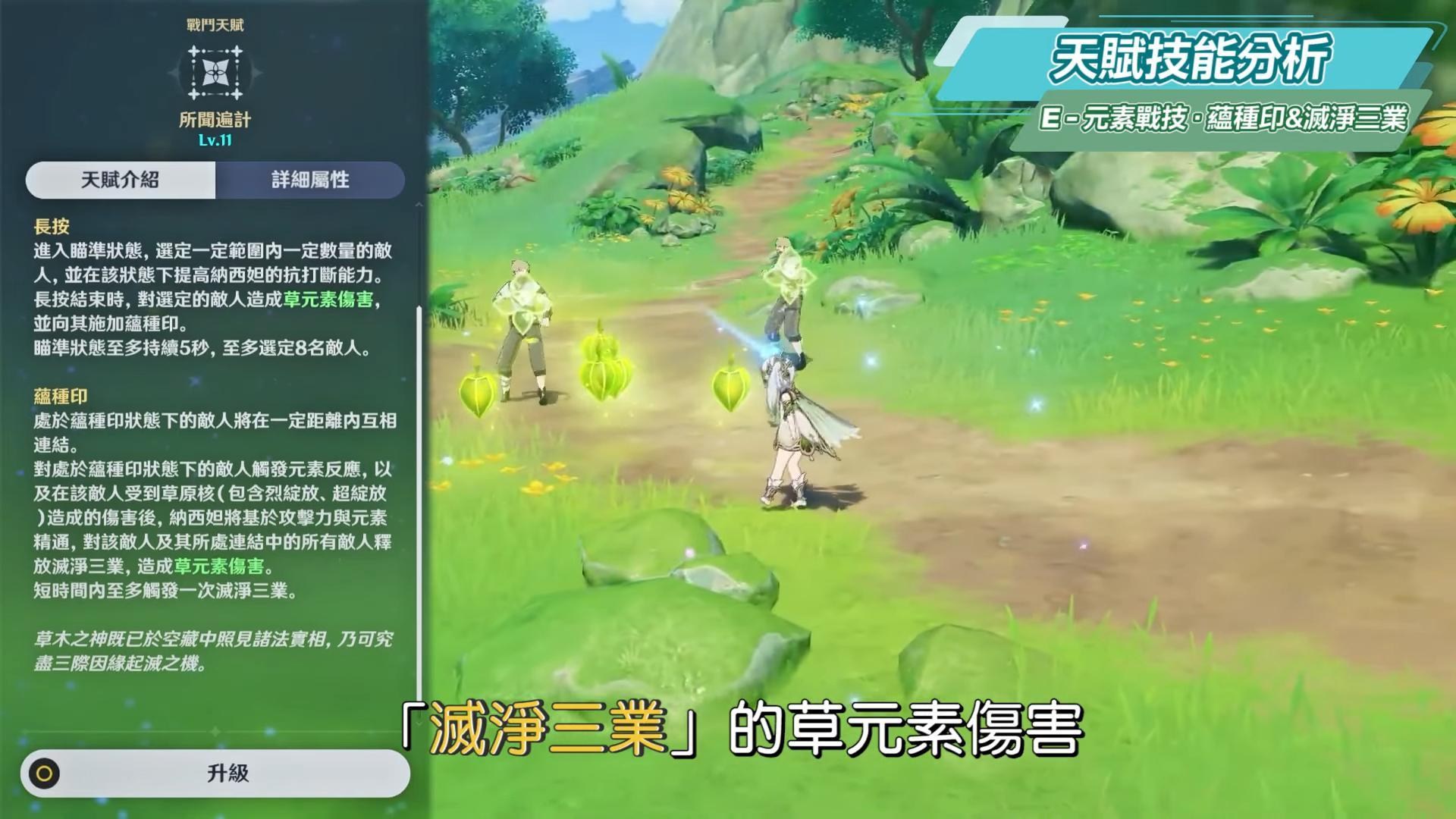 被施加上蘊種印的敵人,彼此處於一定距離之下會互相連結,若是對於有蘊種印的敵人造成元素反應,或是敵人受到草原核造成的相關傷害後,會再基於納西妲自身的攻擊力與元素精通,對敵人再次造成一種名為「滅淨三業」的草元素傷害,這個連鎖反應只要命中其中一個敵人,就會連同其他敵人也會一同受到傷害,假如草原核剛好生成的位置不是在那麼中心的話,只要炸到邊緣的敵人,就會連同其他被連結的敵人一起承受傷害,增加傷害的同時也提高綻放隊草原核位置的觸發成功率,而滅淨三業的連鎖傷害也會遵循前面提到的元素附著攻擊間隔的機制,在每次間隔期間敵人最多只會受到一次滅淨三業傷害。此外也要注意的是,元素戰技命中敵人時並不會產生元素微粒,而是要在滅淨三業對敵人造成傷害時才會產生3顆草元素微粒,冷卻時間7秒,持續時間25秒內最多可以產生9顆草元素微粒,而每次滅淨三業傷害皆可以使敵人被施加中草元素附著,是一個全新的附著量,介於強草與弱草之間。