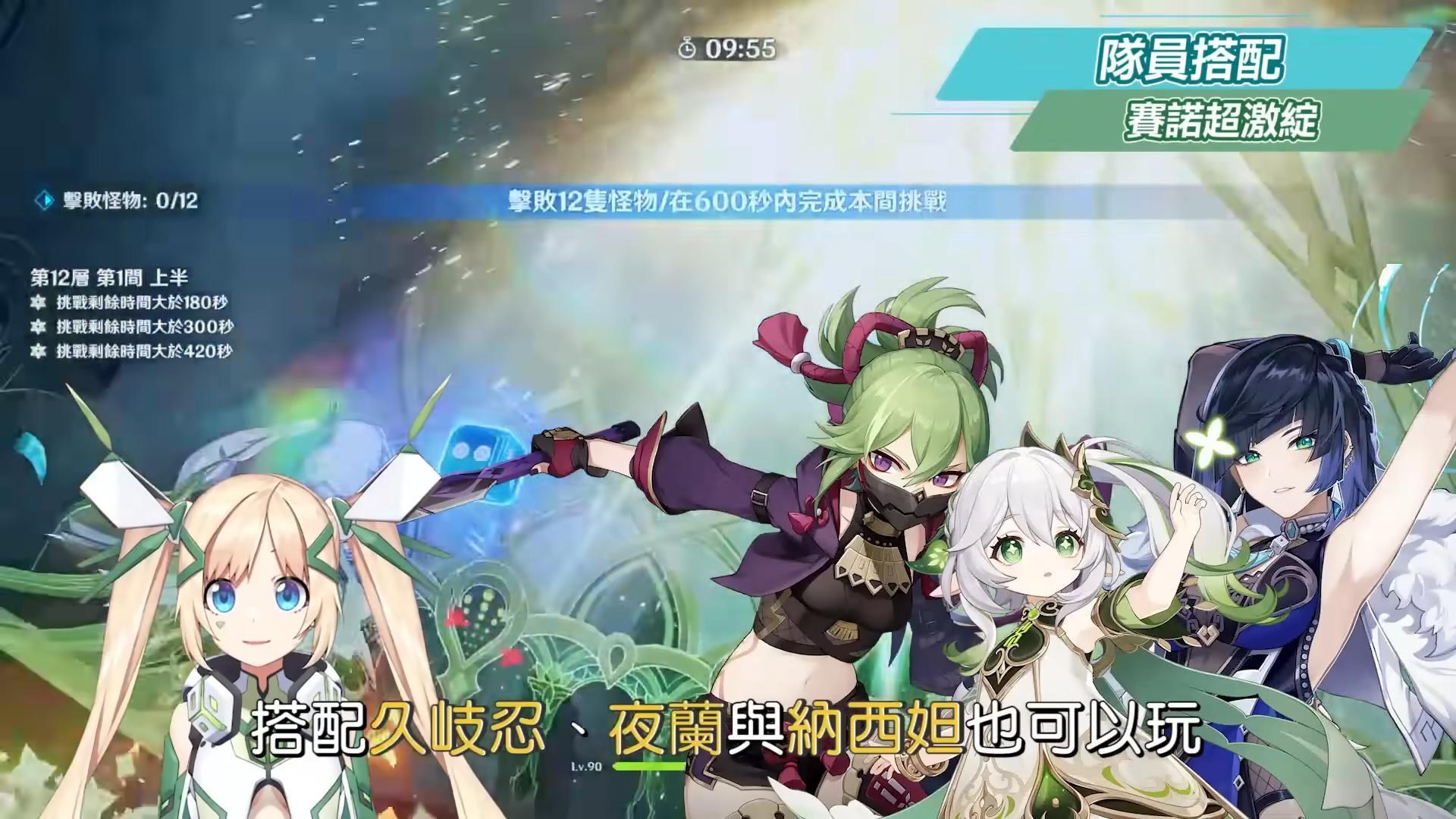 以賽諾站場的輸出陣容,搭配久岐忍、夜蘭與納西妲也可以玩激化+綻放的激綻隊,並且納西妲的大招在雙雷角色的效果下可以使戰技間隔縮到最短,再搭配水和雷元素高頻率的反應之下也會再與草元素產生綻放反應,形成一連串的激化加超綻放連鎖Combo,進而提升總體輸出傷害量。