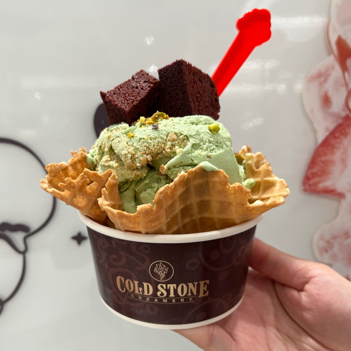 另一款「開心脆脆」,是COLD STONE首次推出的開心果冰淇淋。選用美國德州開心果品種製成,冰淇淋色澤呈現莫蘭迪高級綠灰色系,每一口都品嘗得到天然香甜的堅果味!搭配上紅絲絨布朗尼增加整體風味層次,最後撒上開心果碎粒,口口濃醇!