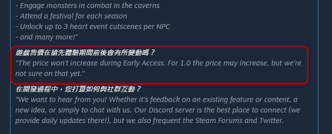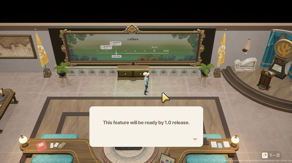 由於搶先體驗遊戲如同前面我們提過的「邊做邊賺」,所以你可能會玩到某個章節,或是遊戲裡面的某些情節、橋段時,會發現部分功能不完整、無法使用,或是直接告訴你要等之後開發進度跟上後更新才會有的內容,所以你如果進度太快,可能玩到一半就無法繼續,或是某些遊戲體驗會不那麼完整。