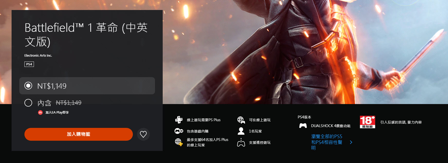 《戰地風雲》系列是EA 旗下廣為人知的第一人稱射擊遊戲,《戰地風雲1》包含單人與多人遊戲,單人劇情中玩家要在史詩般的戰役中殺出血路,從法國城市突圍巷戰,到義大利阿爾卑斯山中戒備森嚴的堡壘戰,或是在阿拉伯沙丘上的激烈戰鬥應有盡有,透過充滿冒險感的戰役來體驗戰爭世界。