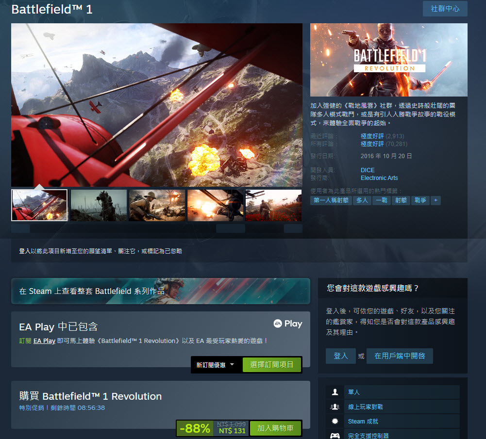 EA 旗下知名射擊遊戲《戰地風雲》系列的《戰地風雲1:革命(Battlefield™ 1: Revolution)》,於Steam推出限時88% 折扣,原價1099元,現在只要131元。