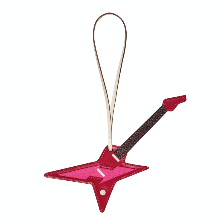 Hermès 的小吊飾絕對是許多人送禮的首選!這款吉他造型的掛飾,運用小牛皮及兩種不同的山羊皮做拼接,外型及觸感滿分的設計,收到的人絕對都會嘴角失守!(商品售價:NTD34,000)
