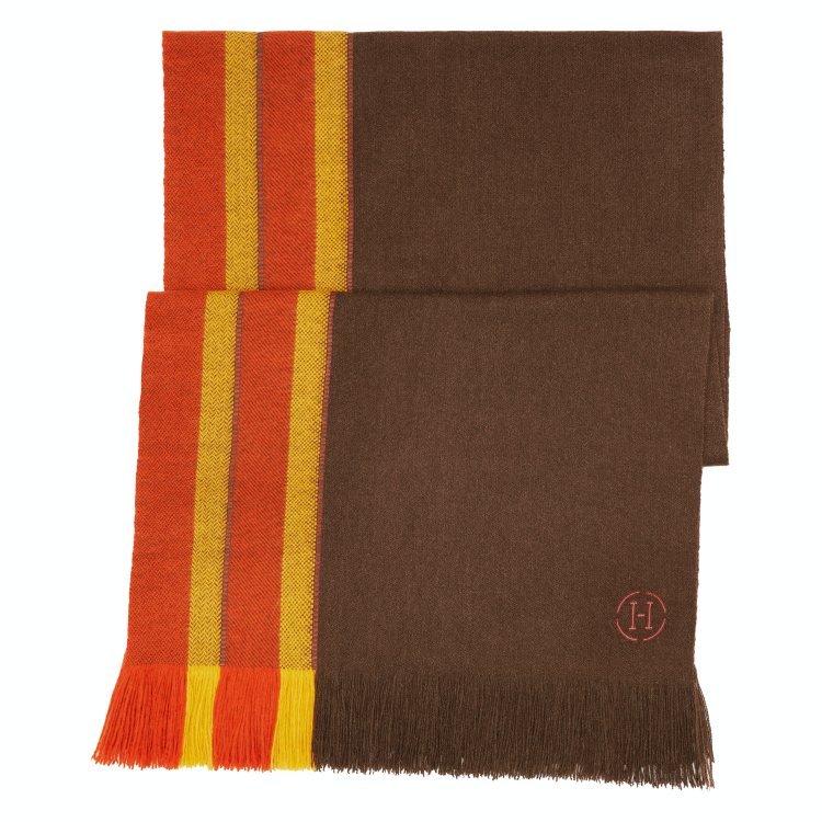還記得好幾年前看過圍巾登上爛禮物排行榜的第一名,儂編想他們一定是沒逛過 Hermès!找親膚又保暖的圍巾,以巧克力大地色做配色,再搭配上代表品牌的橘色以及亮眼的黃,讓整條圍巾以暖色系呈現,中性的設計男女都很適合。(商品售價:NTD37,100)