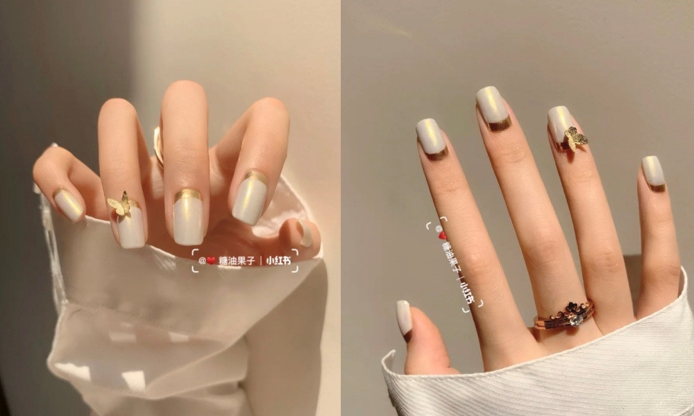 想讓雙手呈現滿滿的高級感?利用金屬色系絕對是最佳選擇!以白色做為基底在月牙上勾勒出金色線條,在外緣甲面上再搭配上淡淡的偏光,讓雙手隱隱約約透出光芒,讓人忍不住想多看一眼~也可以在指尖上放上小蝴蝶,質感點好、點滿!