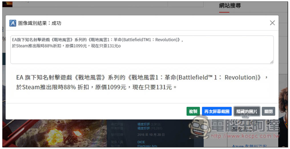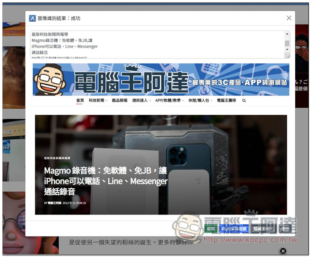接著等待個幾秒鐘就能看到辨識結果,這工具還有一個很貼心的功能:「顯示圖片」,可以讓你比對文字和圖片,來確認是否辨識正確,不得不說還真的蠻不錯的,擷取範圍中有文字的部分都有辨識出來,連選單列部分都有,中文、英文夾雜也可以。當然,有一些還是有辨識錯誤,但 95% 以上都很準確: