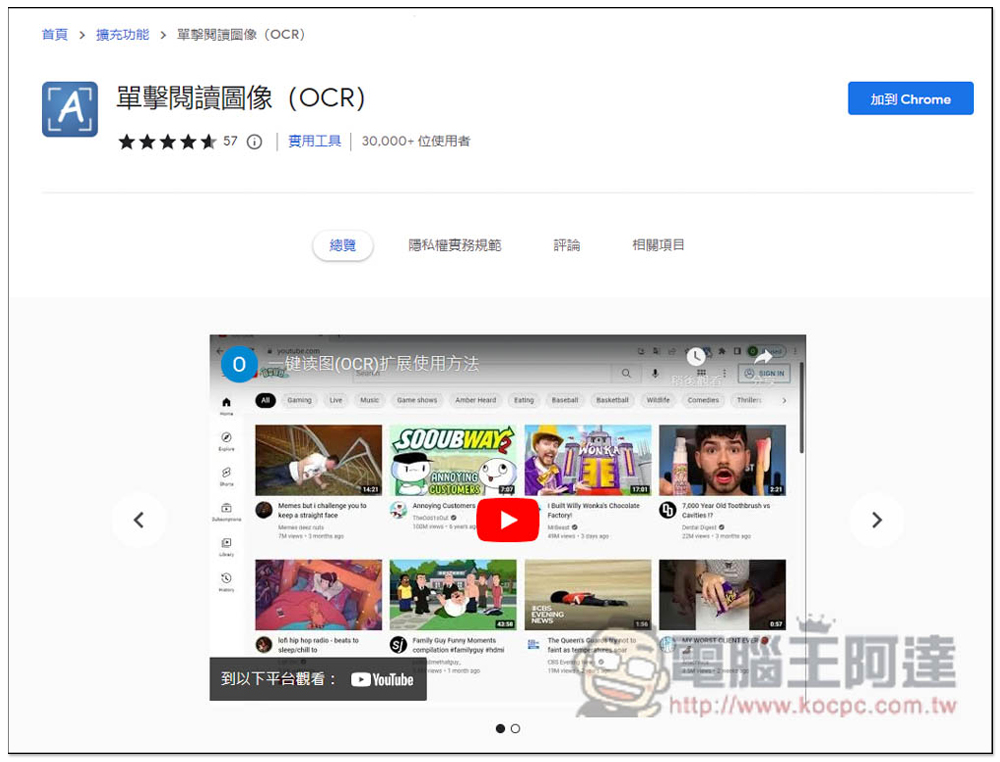 進到單擊閱讀圖像(OCR)的商店頁面後,點擊右上角的加到 Chrome 進行安裝: