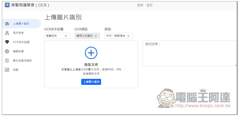 使用方式非常簡單,打開工具圖示後,會看到六個功能,「捕獲 OCR 選擇」、「上傳圖片文件」、「免費版本」、「語言」、「更多的」與「登錄」,不用註冊帳號就能使用,所以最後的登錄不用理會。而免費版只能選擇通用文本識別,所以這也不用改,主要就其他四個功能。