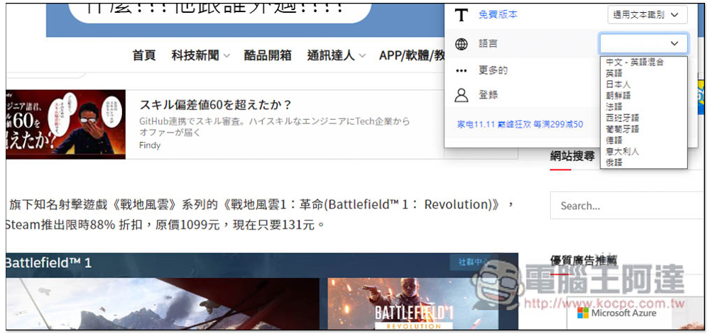語言部分可以選擇「中文 - 英語混合」、「英語」、「日本人」、「朝鮮語」、「法語」、「西班牙語」、「葡萄牙語」、「德語」、「義大利人」與「俄語」,中文和英語部分應該是不用選,我一開始測試也沒選: