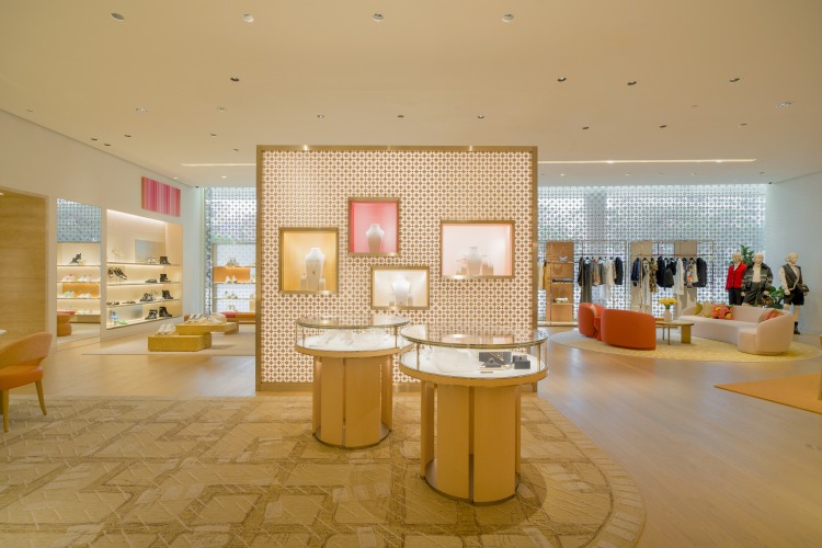 相比於打造一個購物空間,Louis Vuitton 更想讓走進來的顧客像是進到一座美術館,因此在家具上的挑選便格外用心。走進店裡,映入眼簾的是皮件與女士飾品配件區,入口處的桌子是來自 2017 年創立的實驗性品牌 BUZAO Studio,Louis Vuitton 以其工作室最具特色的玻璃家具點綴整體空間,穿過石灰色的拱門來到女士區與 VIC 的專區,左側則是通往旅行主題區與男裝區,在此處則陳列的同樣來自 BUZAO Studio 的錯位(Dislocation)系列的桌子。