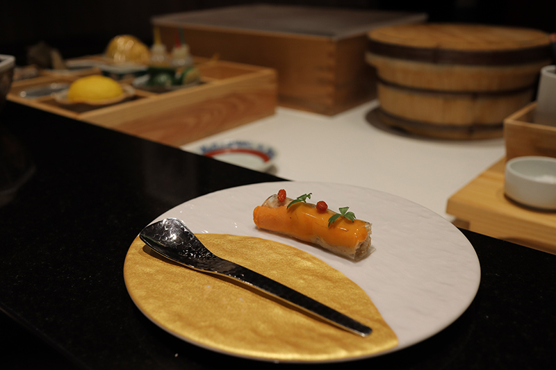 吃板前料理最有趣的是,能坐在台前欣賞師傅的「表演」,即便不聊天也不會感到冷場無聊。當天我們算是前幾批吃到大閘蟹季的客人,每次阿謙師傅遞上餐點的同時,總會偷喵客人的反應,看到客人發出驚呼的聲音,師傅的總會有一種放鬆的感覺,作為料理人或許最大的成就,就是每個客人都能帶著滿足的心情回家吧!還有件蠻有趣的事情,當天我一如往常帶著單眼相機,服務生便一個箭步拿出軟布讓我的相機靠著,沒想到相機(手機)先食的文化顯然已成為「常態」了!
