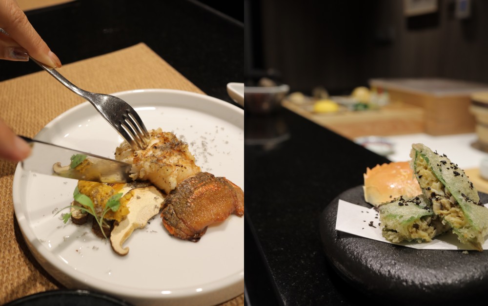在本季推出的大閘蟹季之中,阿謙師傅同樣運用了歐日系的手法,其中有一道「大閘蟹肉茶碗蒸」在經典不過的茶碗蒸,使用大閘蟹昆布湯製成基底,滑嫩的蛋液中豐富的鮮甜海味,再搭配上大閘蟹腿肉、蟹膏,「過去茶碗蒸不太會放入魚子醬的元素,因為蟹膏味道很濃,魚子醬鮮味很足夠味道不會被彼此搶過,反而又會多了另一種層次。」除此之外,「扇蝦奶油燒」也很讓人為之驚艷,上桌前服務生會特別換上西餐具,以日本奶油燒的作法延伸,搭配上香料刨上風乾的鱘魚子,雖然擺盤上法味十足,但一入口又能品嘗到日式的淡雅滋味。