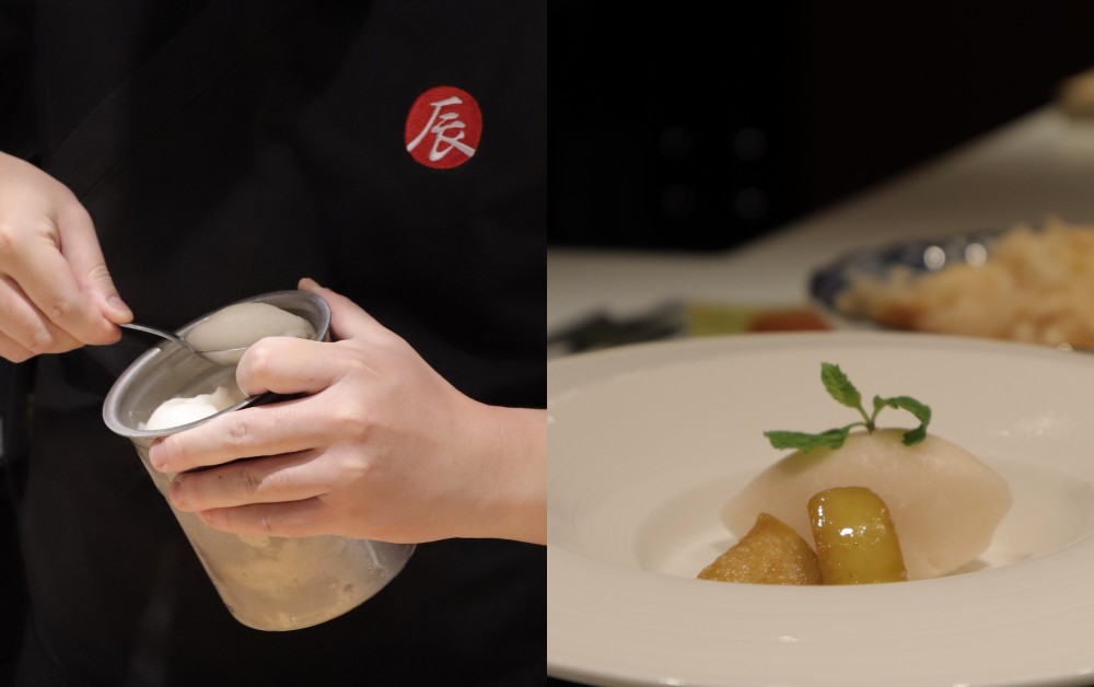 從第一口再到最後收尾絕不冷場!甜點部分則打出最後一張ACE「蜜蘋果生薑沙碧」,對自己料理格外要求的他,捨棄現成的製冰機,試了無數次才找到對的口味。以日本常見蟹餐尾聲會配上一杯薑茶做發想,因為螃蟹較寒冷,搭配上生薑能有暖身的效果,以薑汁製作沙碧(Sherbet)搭配蜜釀蘋果,中和生薑的辛辣味,畫上一個完美的句點。