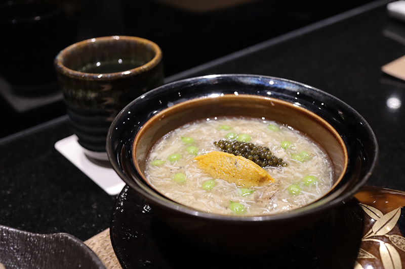 阿謙師傅擅長在第一道菜給人火花般的驚艷味覺做開場,同時在大閘蟹季中也能見到這驚喜。阿謙師傅說到「這一道『大閘蟹肉|水海膽|藥膳湯凍』是我花最多時間的一道菜,因為是秋蟹季,我希望以一個中藥香氣的溫潤感做呼應。」搭配上口味極鮮甜的水海膽增添蟹肉香甜,加入當歸、枸杞等中藥材製成湯凍,一入口你會先品嘗到當歸香氣,再來吃到大閘蟹肉的細緻肉質,最後以水海膽鮮甜最尾聲。