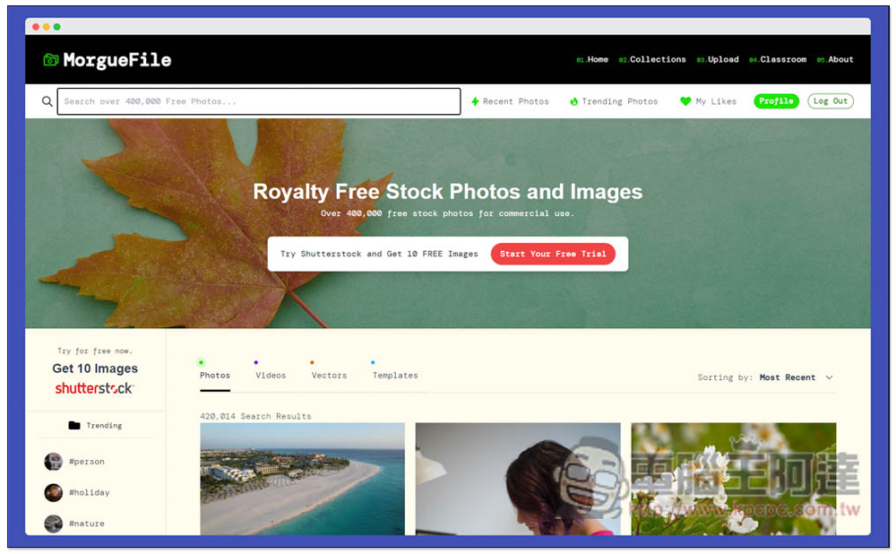有一點要注意是,首頁下方雖然有四種素材分類,如:Photos 圖片、Videos 影片、Vectors 向量圖和 Templates 樣板,但 Morguefile 的免費素材就只有圖片,其他都是另一個付費素材網站 shutterstock 提供,所以千萬別載錯了: