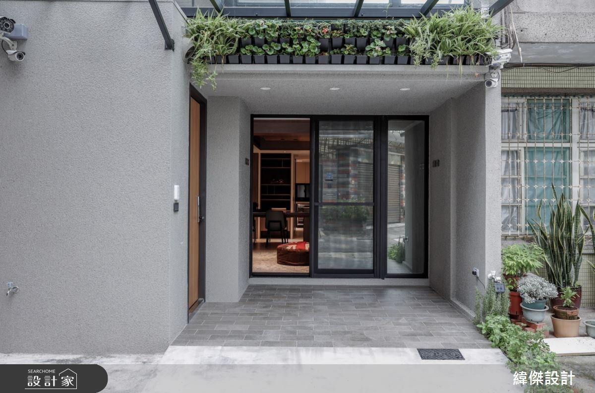 日系無印風的美學作爲翻新主軸,建築外牆刷上STO塗料,藉米色立面及局部植物,呈現日系優雅風貌。大門兩側以玻璃呈現,導引光線入內,提升街屋明亮,並安排深木色與鐵件,建構出溫潤沉穩的門面氣質。