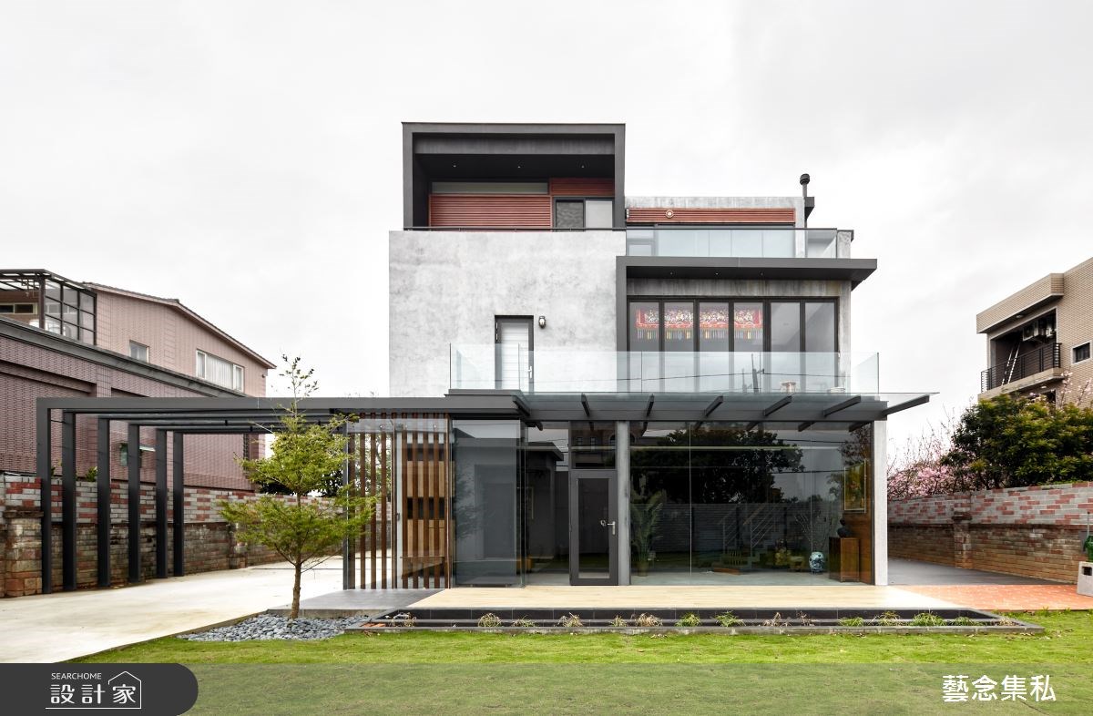 長子夫婦為讓母親享受天倫之樂,決定自地自建蓋一棟屬於家族團聚的傳承別墅,從舊屋拆除、山坡整地、水土保持、建築設計到室內裝修,設計團隊歷經四年為屋主一家人實現夢想。建築外觀由幾個長方體高低錯層的方式組合,大片玻璃窗盡收採光及滿地綠意,成為家人團聚、露營的美好場域。