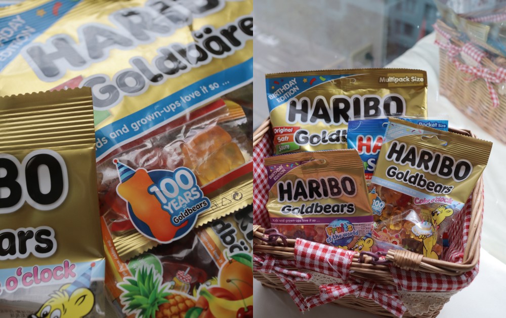 回到百年後的今年,小熊軟糖100歲生日!Haribo首度推出4款精選「一百週年限定款」,第一款為濃濃慶生味的「糕點風味」經5款經典蛋糕變成軟糖,如檸檬甜餅乾、黑森林蛋糕、草莓蛋糕、覆盆子甜甜圈、蘋果甜餅乾、蘿蔔蛋糕等。限定款「哈瑞寶明星總動員」可愛又值得收藏!內含小熊、可樂、愛心、戒指、荷包蛋5種經典造型。