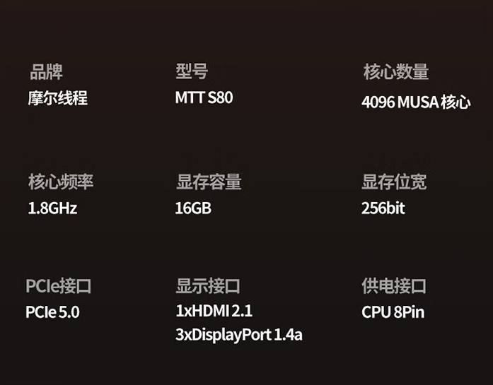 不過 MTT S80 可處理 AV1、H.264 和 H.265 影像解碼,提供 3 個 DisplayPort 1.4 和 1 個 HDMI 2.1 影像介面,還是目前世界上第一張搭載 PCIe 5.0x16 介面的消費型顯卡。
