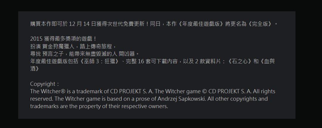 在Steam為壓倒性好評,由CD Projekt RED在2015年於PC及家用主機版推出的《巫師 3:狂獵(The Witcher® 3: Wild Hunt)》,CD Projekt RED近期宣布次世代版本更新將於 2022 年 12 月 14 日推出,凡已擁有任一版本《巫師 3:狂獵》遊戲的玩家皆能免費取得。