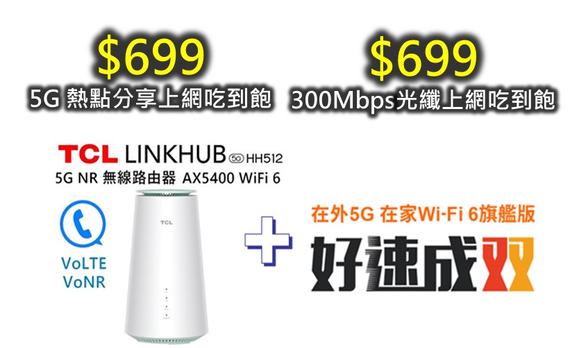 若要享有5G熱點分享不限速上網吃到飽只要$699/月,必須自備5G手機或是5G無線路由器。若是家裡定點多人使用,建議添購合適的5G無線路由器。目前坊間可以支援5G 行動/寬頻二合一的高性能路由器唯一選擇就是【TCL LINKHUB HH512 5G NR 無線分享路由器】。
