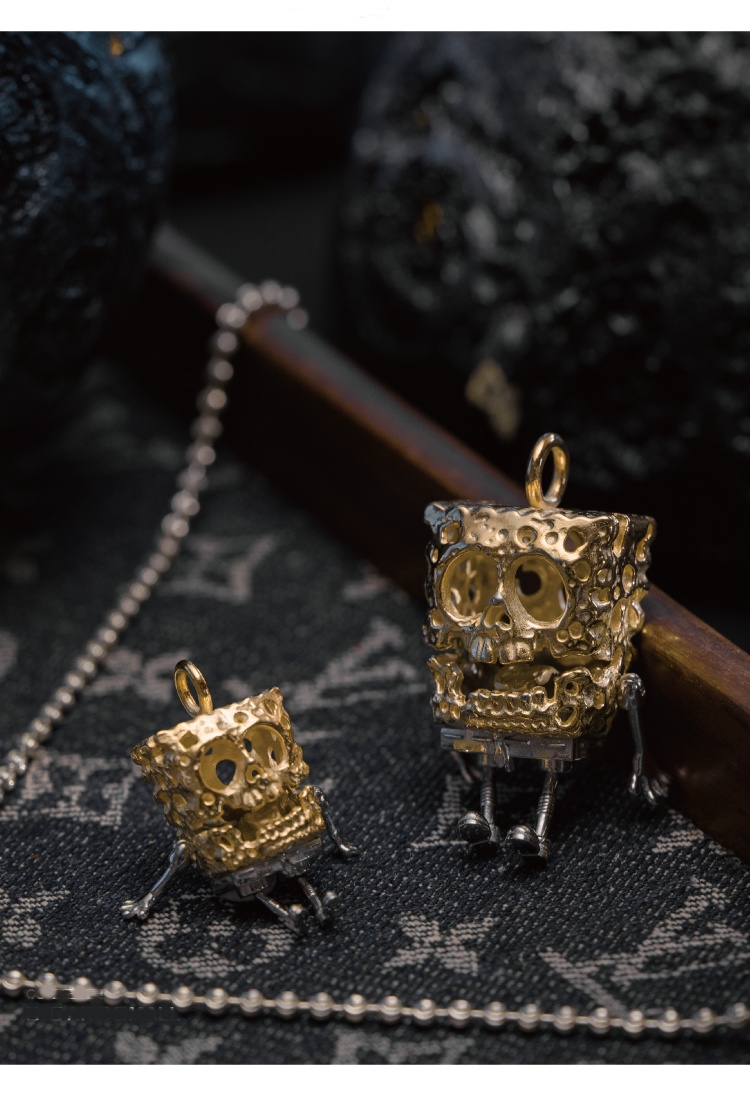 當海綿寶寶變成骷髏?這款海綿寶寶吊飾用925銀鍍金的材質,帶有嘻哈感,不論是自用或者送禮皆可。且海綿寶寶的四肢皆可活動,下顎也可以開合,很適合當成周邊玩具小物擺飾在桌上。有兩種尺寸可選。