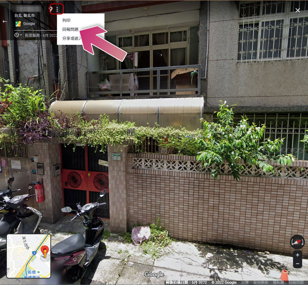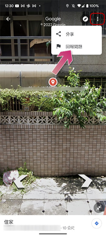 - 看到街道或房屋、汽車圖片後,點擊家庭地址旁邊三點選單,從中選擇「回報問題」。
