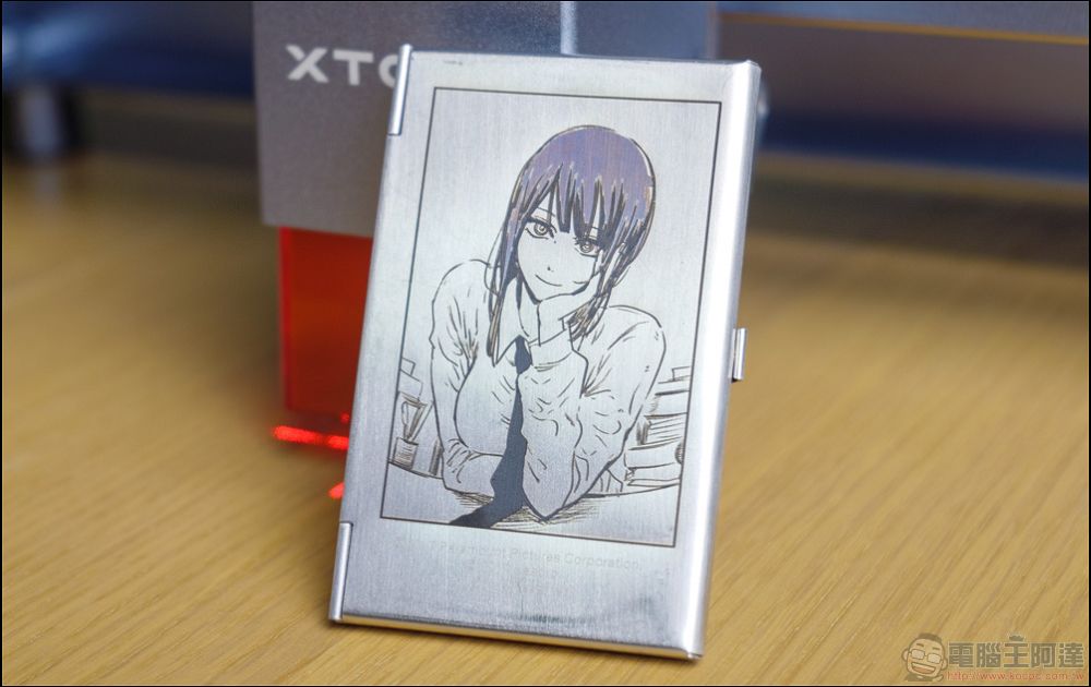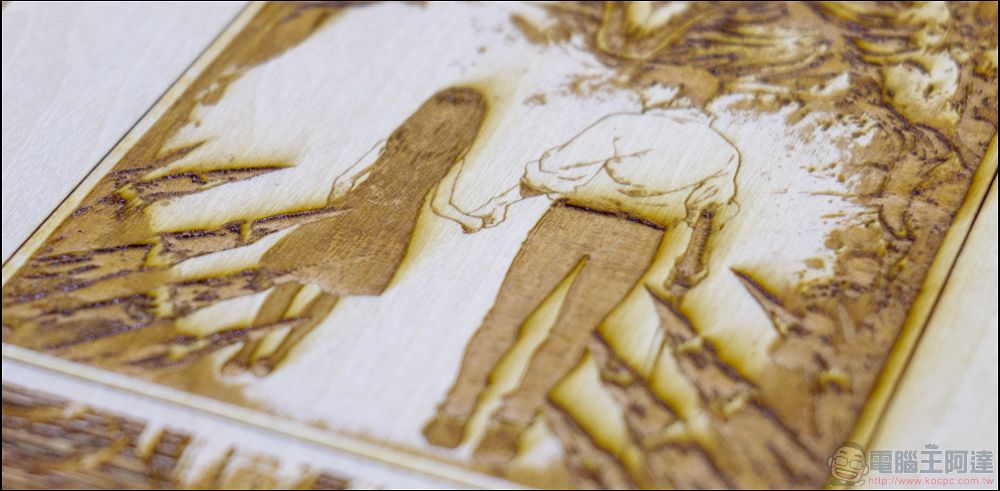 最後是像這種整頁細節非常多的漫畫封面轉雕刻,光是檔案切片處理就跑了10幾分鐘,最終雕刻時間為80分鐘,可以發現在許多細節處都非常的完美,尤其是圖片上漸層的地方也可以非常精準的呈現,不過可以看到標準字和最下面作者字的地方,原圖都是比較淺色的效果,因此雷雕後也會有比較不清的效果,這部分在挑選原圖時也需要特別留意,才能雕出理想的成果: