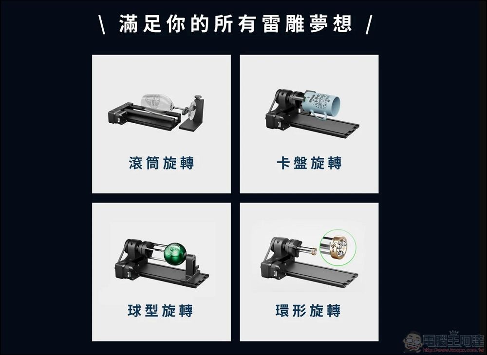 最後要特別來介紹一下這次全新的xTool RA2 Pro旋轉套件,其實認真要說相比前一代的旋轉套件,就是多了另外三個模式:卡盤旋轉、球型旋轉、環型旋轉,由於第一代旋轉套件只有滾筒旋轉,但滾筒旋轉只適用於直徑上下都相同的圓柱體,但是很多瓶瓶罐罐可以加工的都是上下直徑不同,因此滾筒模式相對難用,因此多了另外三轉模式,讓旋轉加工的部份更多元: