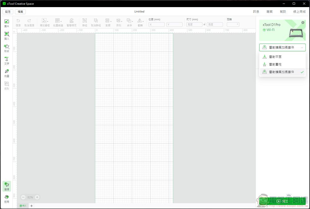 然後針對xTool D1 Pro的特性,有搭配另外兩個套件的專屬模式,搭配xTool RA2 Pro 旋轉套件的雷射圓柱模式以及搭配加長套件的加長模式,有著430×926mm 超大的加工範圍,對於較大型物件有著更好的加工性: