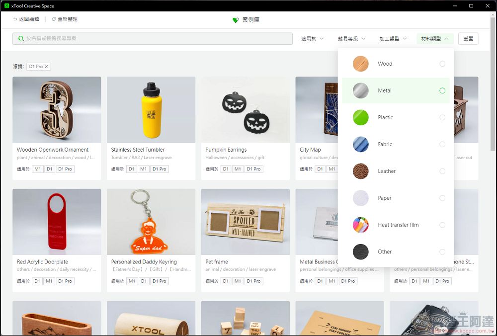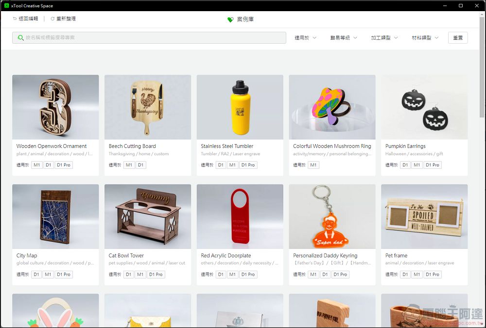 也可以透過不同的分類去尋找自己需要的專案,依照不同機型、不同難度、不同加工方式以及不同材料去分類,畢竟不同機型可以加工的材料不同,這點就需要特別注意: