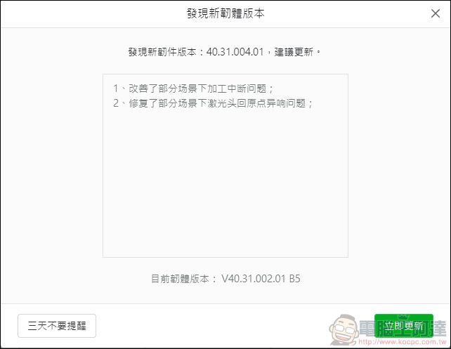 透過xTool Creative Space可以直接針對xTool D1 Pro進行韌體更新: